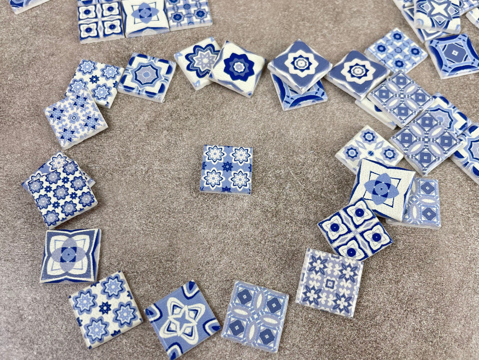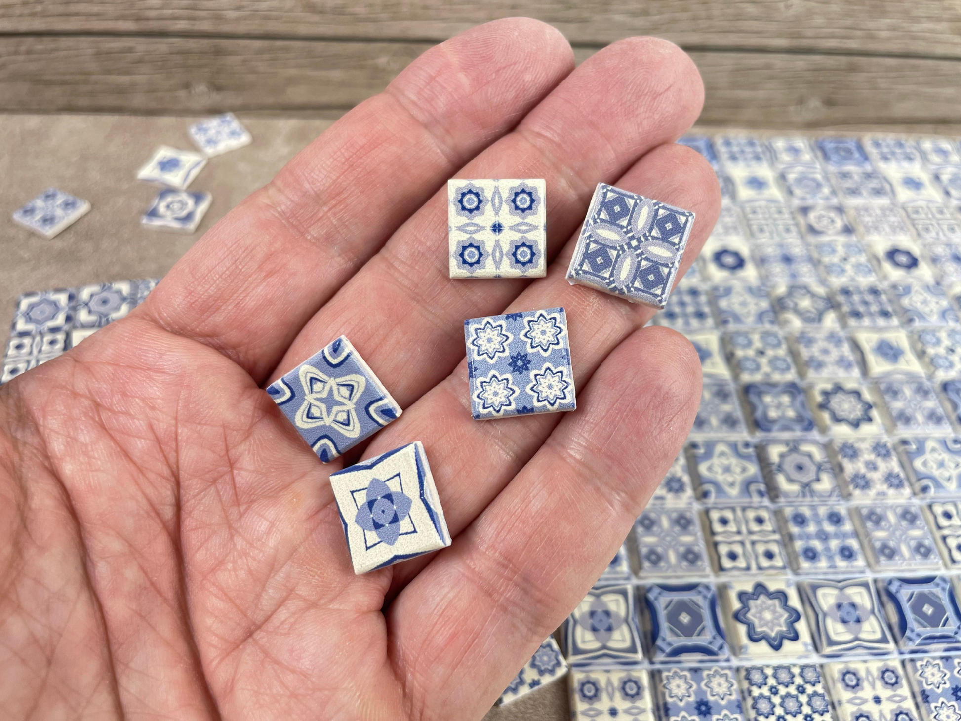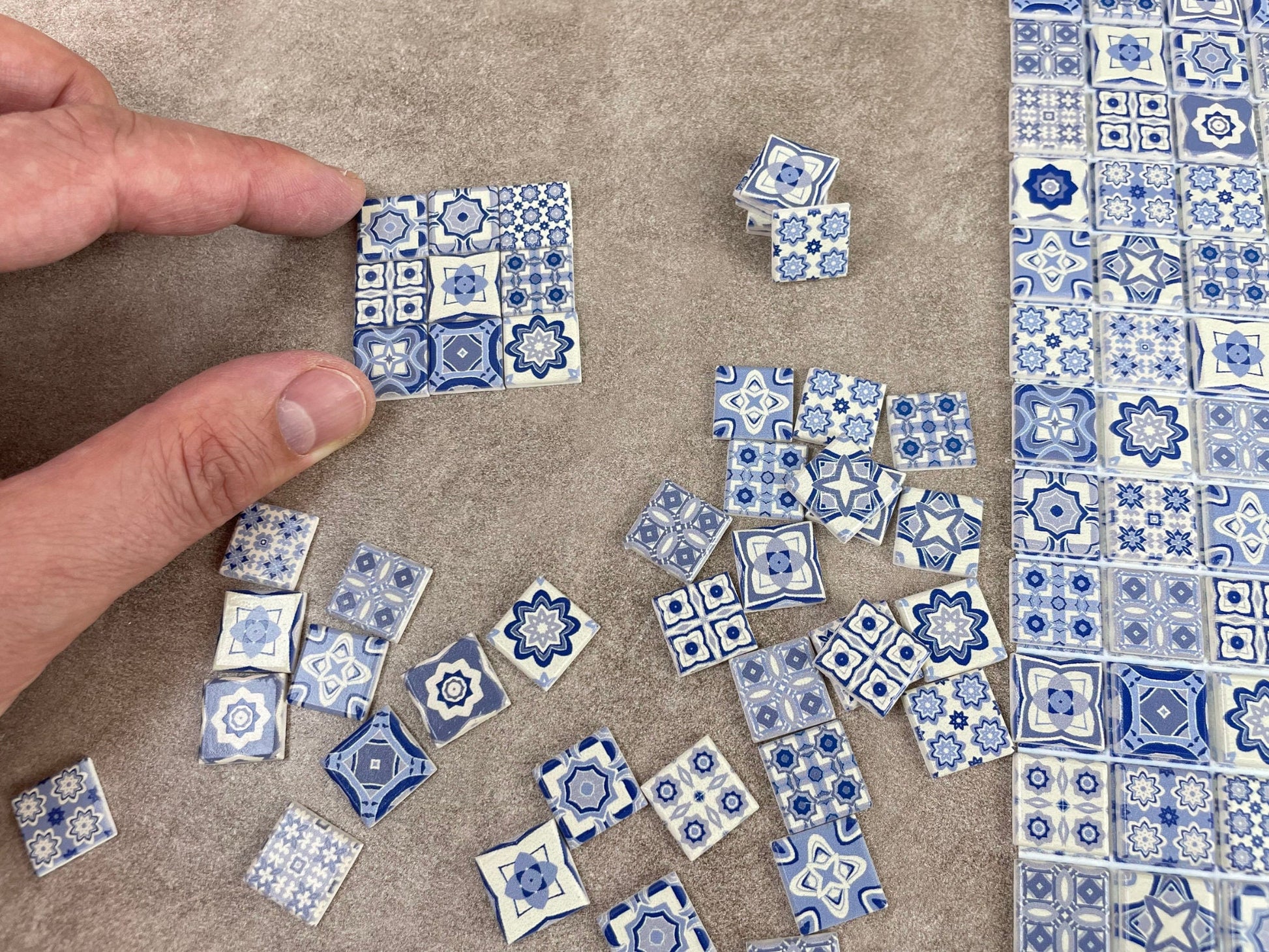Ein Satz Miniaturfliesen. Sie bilden ein hübsches Ornament und Sie können auch mehrere Sätze verwenden, um eine große Fliesenplatte auf dem Boden oder an der Wand Ihres Puppenhauses herzustellen. Puppenhausfliesen sind für den Maßstab 1:12 oder 1:24 ausgelegt.